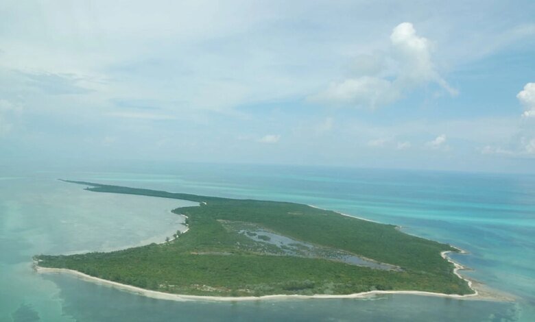 ماذا يوجد في الصورة؟ ضفاف رملية تحت الماء وشعاب مرجانية تحيط بزوج من الجزر الصغيرة
