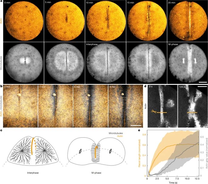 3a: the band retraction in interphase arrested embryos experiment was repeated in at least n = 10 individual embryos. Fig. 3b: the band retraction in interphase arrested embryos followed by microtubule depolymerization was repeated in n = 8 embryos. Number of replicates of representative images in the Supplementary Figures. Supplementary Fig. 1a: at least n = 10 individual embryo replicates (with confocal spinning disc imaging instead of light sheet). Supplementary Fig. 1b: at least n = 15 individual embryo replicates